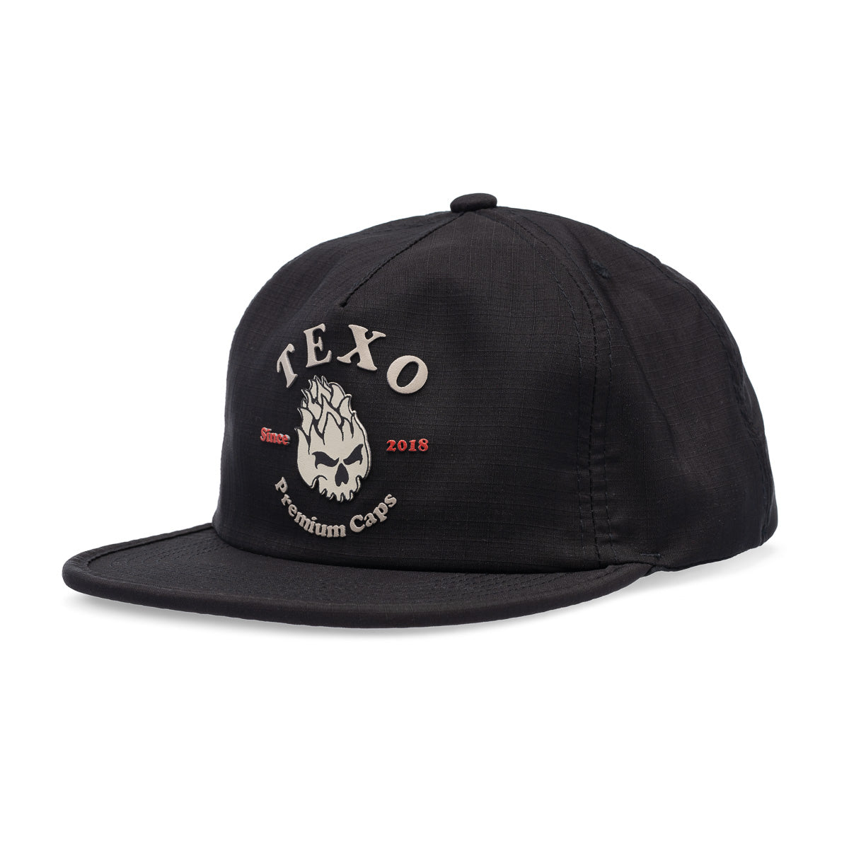 Feito em tecido ripstop preto, ele carrega uma estética urbana com pegada técnica: o mesmo tecido usado em jaquetas e calças de combate, mas aqui com uma aplicação streetwear. A frente sem estrutura se molda naturalmente à cabeça e proporciona um caimento mais orgânico, enquanto a aba reta de EVA mantém leveza e resistência.