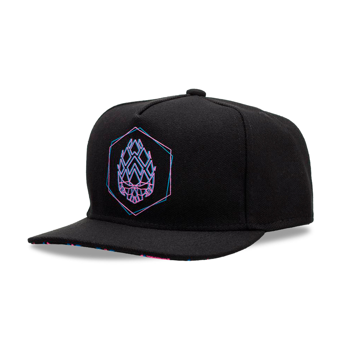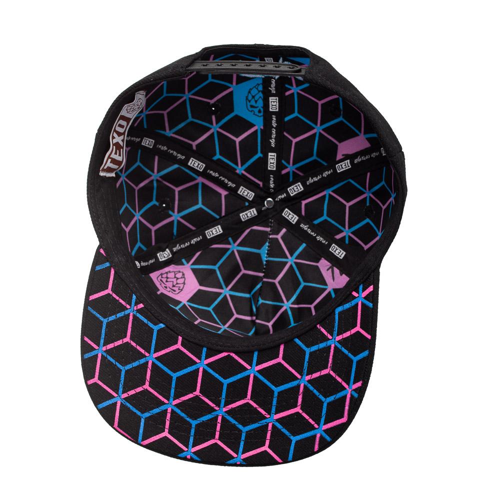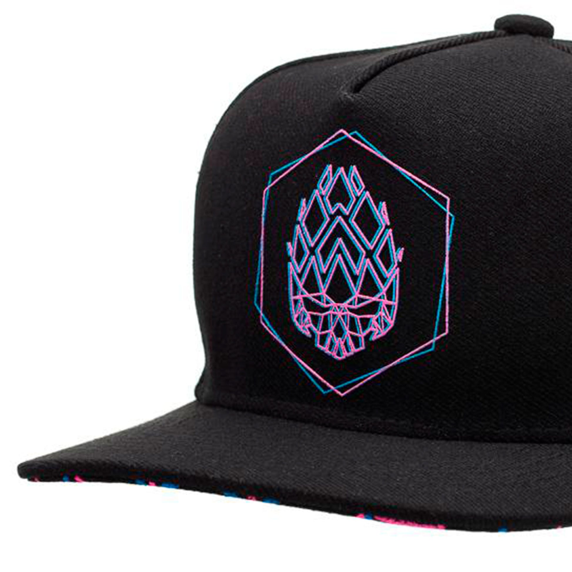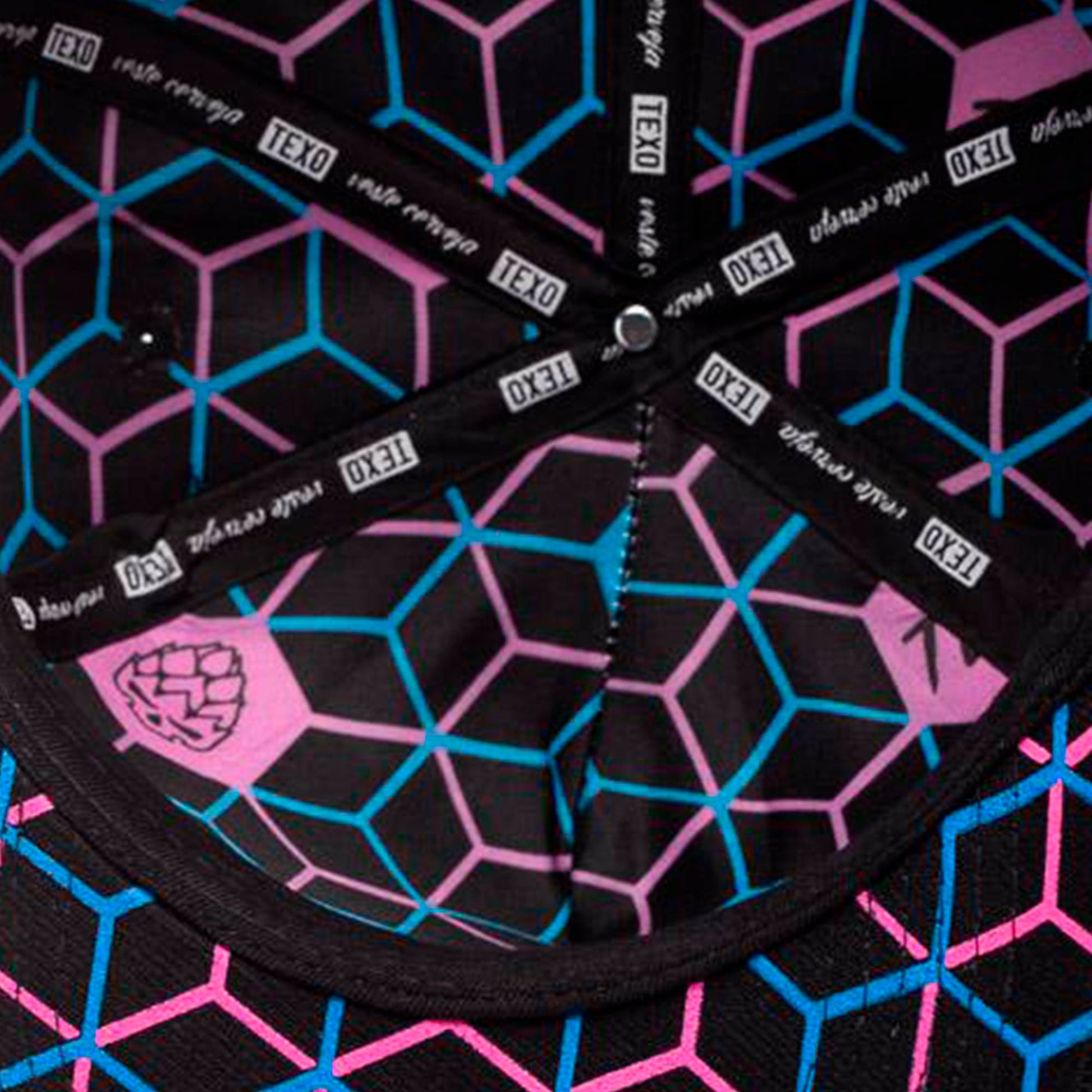 O azul e rosa combinados lembram um pouco as velhas placas de neon dos anos 80, muito utilizadas para compor os futuros distópicos em clássicos da cultura pop. Tecido O Boné é feito em tecido Poliéster Premium. Fecho O fecho regulador é o clássico snapback, que permite que o boné se ajuste a diversos tamanhos de cabeça.