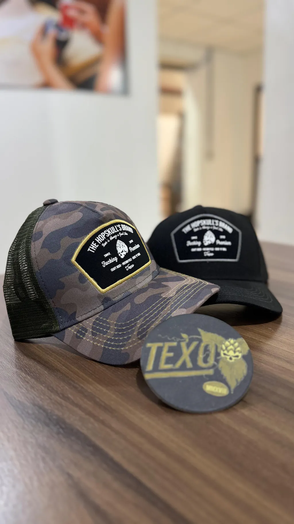 Com estampa camuflada na parte frontal e aba, e telinha verde militar na traseira, ele combina resistência e respirabilidade na medida certa. O patch frontal, em preto com contorno bege, carrega as frases que definem o estilo Texo e a Hopskull estilizada como selo de autenticidade.